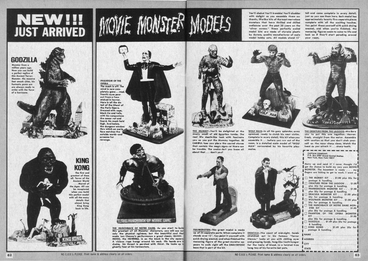 I think the merchandising of the monsters also had a big role to play in this. I read and was endlessly fascinated by the collectibles that had been made, particularly the Aurora Monster Kits, a series of model kits made in the 60s that you could assemble and then paint based on the classic Universal Monsters characters. I would also google endlessly the Sideshow Collectibles range of statues on the internet, something I could never afford but would always salivate just thinking about owning one!