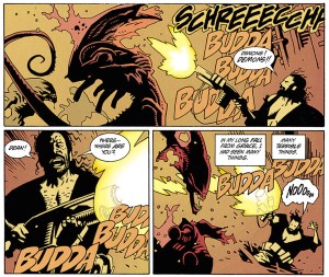 As for the graphic novel itself, I was very slightly disappointed with the production. For just under £9.00 new you can’t really complain, but I wish Dark Horse had spent time remastering the pages. On quite a few pages the colouring isn’t quite what it should be; it’s never terrible, but it lacks the definition that I’m sure the artists wanted. It looks a bit fuzzy, almost as if Dark Horse had used low-quality images to print. It’s only a small nitpick though; for the most part the printing is good, and having it printed on thick, high-quality paper is great. Likewise, the title design and the new cover, illustrated by Mignola, are wonderful. It’s a nice looking book, in hardcover, and under £9.00. You can’t really complain about that!