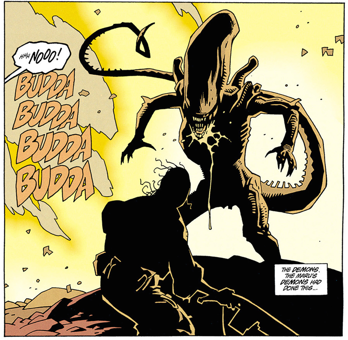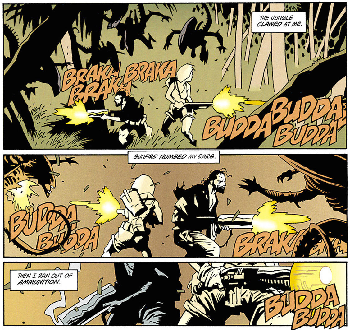 But Dave Gibbons isn’t why I bought this. Rather, it’s the idea of Mike Mignola illustrating Aliens. Those films are probably the closest that cinema has come to depicting Mignola’s inky black style, and whilst this is done in some scenes in the comic, the story deprives the opportunity of that claustrophobia that the films had by setting it almost entirely in a jungle. Still, it’s great to see Mignola illustrate these scenes, and he handles the look of the aliens better than any other comic artist I’ve seen. As always his figure work is wonderful, and his unique style of illustration is always a pleasure to see. Mignola’s work is the real reason to read Aliens: Salvation; no one draws like he does.