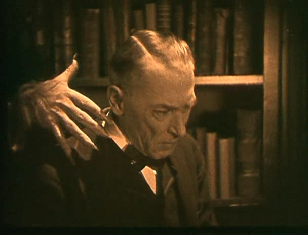 Soon, a guard (George Siegmann) arrives saying that that an escaped lunatic is prowling the grounds of the mansion – and that he’ll kill anyone he sees. Crosby (Tully Marshall), the lawyer thinks that, due to the fact he discovered the sealed envelope opened, that one of the heirs is planning harm to come to Annabelle. Just as he is about to warn her, a secret passage is opened and a clawed hand pulls him inside. The heirs all think she is clearly insane.
