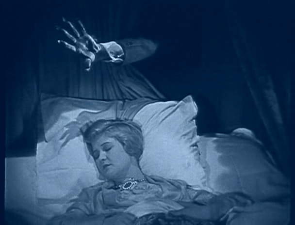 As Annabelle is sleeping, a clawed hand appears from the wall and takes the diamonds she is wearing. She calls everyone in – they all think her insane – but she and her cousin Harry (Arthur Edmund Carewe) discover a secret passage way. Inside is the dead body of Crosby the lawyer, who falls down stark dead. Everyone runs in hysterics. When Paul Jones (Creighton Hale) and Annabelle return to search the body for the missing envelope, they find that it is gone. Paul goes inside the passage and is lost instantly. Paul finds a disfigured, cloaked figure – the escaped lunatic? – and does battle with him. Paul is knocked out, but he comes around and saves Annabelle from being killed by the figure. The police arrive and arrest the lunatic, only to discover it is Annabelle’s cousin Charlie (Forrest Stanley), with the guard an accomplice. They aimed to drive Annabelle insane so they could get the inheritance. Paul and Annabelle snuggle on the sofa and decide to live together in the house and share the inheritance.