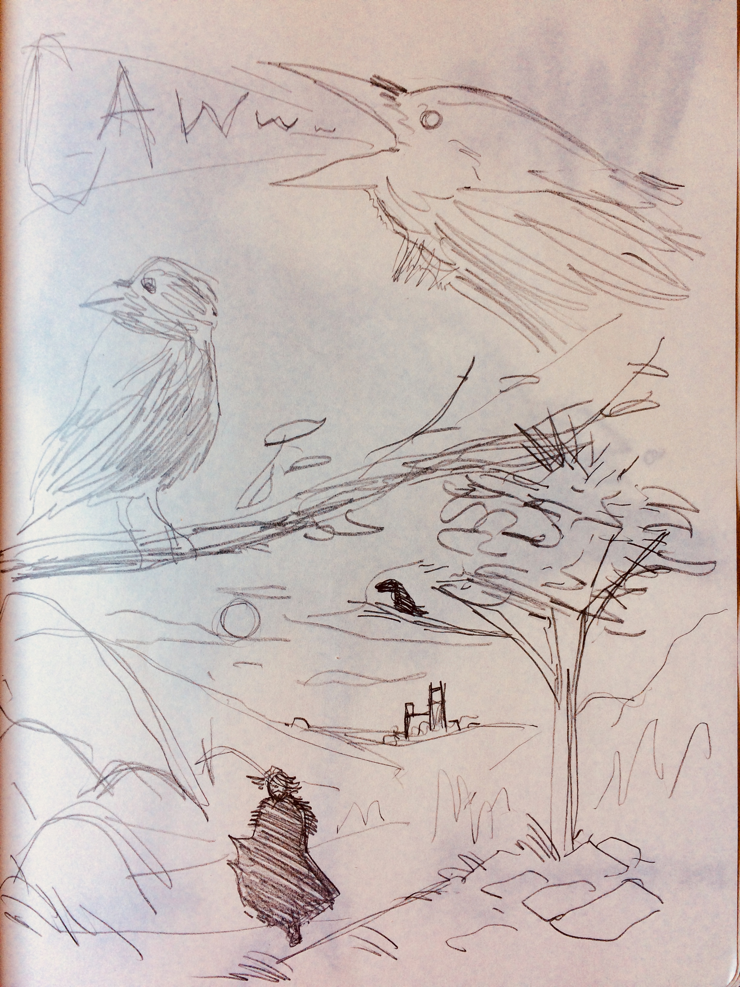 Whilst I was happy with the layout of the first page in the first thumbnail above, I was unhappy with the flow of the eyeline – starting at the crow, cutting left to follow the words, and then down through the page. I redrew this thumbnail a second time, and felt I had better achieved the flow of the page. I also realised that I needed some practice drawing crows, so I did the following ink drawing to practice.